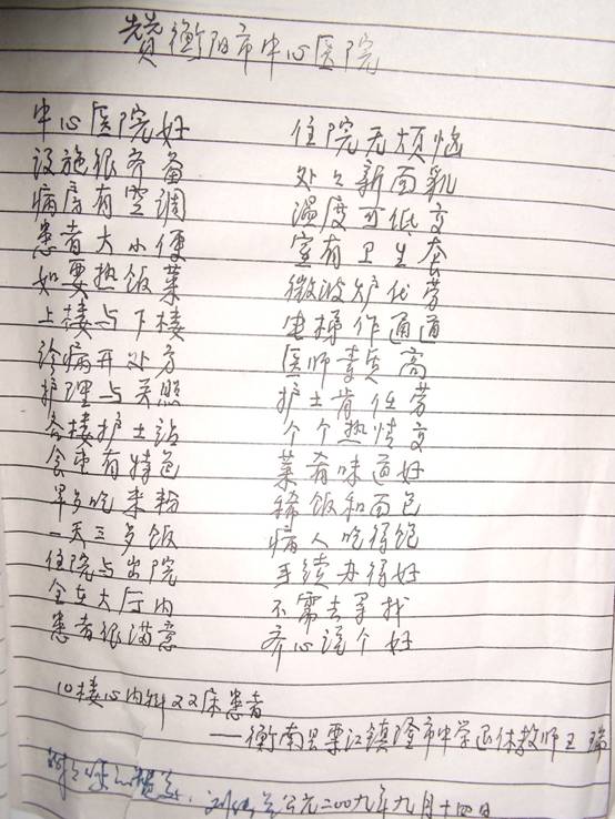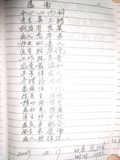 一個(gè)留言本的感動(dòng) 發(fā)布時(shí)間:2009年11月13日 預(yù)覽:11666次 一個(gè)留言本的感動(dòng) 中心醫(yī)院內(nèi)科住院大樓十樓心內(nèi)科,醫(yī)護(hù)人員在長(zhǎng)長(zhǎng)的走廊里輕盈地走過(guò),細(xì)細(xì)的充滿(mǎn)關(guān)切的醫(yī)患交談的話(huà)語(yǔ)不時(shí)掠過(guò)耳畔。 走廊的中間的一幅板報(bào)邊,有這樣一個(gè)小本子,紅色的封面上寫(xiě)著“患者留言本”幾個(gè)字,這個(gè)本子不怎么起眼,也許是翻閱的人多了的緣故,已經(jīng)微微有些發(fā)皺、發(fā)黃。 但是,每次閑暇時(shí)翻起時(shí),我們常常會(huì)有許多的感動(dòng)。 寫(xiě)在上面這些話(huà)語(yǔ),暖暖的,和風(fēng)細(xì)雨般,讓我們感到到作為醫(yī)護(hù)人員是如此的崇高與圣潔。 同時(shí),也讓我們更加堅(jiān)定在這個(gè)平凡的崗位上更加努力的信心與斗志! 我們雖然有些付出,但是我們所收獲的是如此多的真情。 現(xiàn)摘錄以下幾篇與大家共勉。 (心內(nèi)科 周艷輝) …… 在此,謝謝所有的病友,有你們的支持、理解與肯定,我們會(huì)倍加的努力!祝你們健康平安!