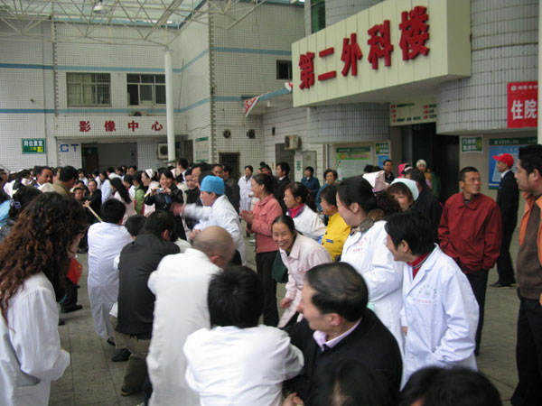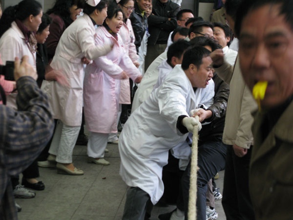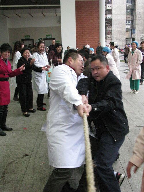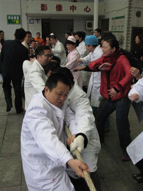 中心醫(yī)院積極倡導(dǎo)運(yùn)動(dòng)防病 發(fā)布時(shí)間:2009年11月13日 預(yù)覽:3536次 中心醫(yī)院積極倡導(dǎo)運(yùn)動(dòng)防病 在全民狙擊甲型H1N1流感病毒的季節(jié),衡陽市中心醫(yī)院身體力行“現(xiàn)身說法”,積極倡導(dǎo)通過科學(xué)運(yùn)動(dòng)提高健康素質(zhì),增強(qiáng)肌體防病抗病能力。繁忙的醫(yī)療工作之余,他們組織員工開展拔河、乒乓球賽、登高等運(yùn)動(dòng)。圖為11月13日,該院醫(yī)護(hù)人員開展拔河活動(dòng)和在門診大樓舉行“挑戰(zhàn)21層”爬樓比賽情景。(鄒建軍)