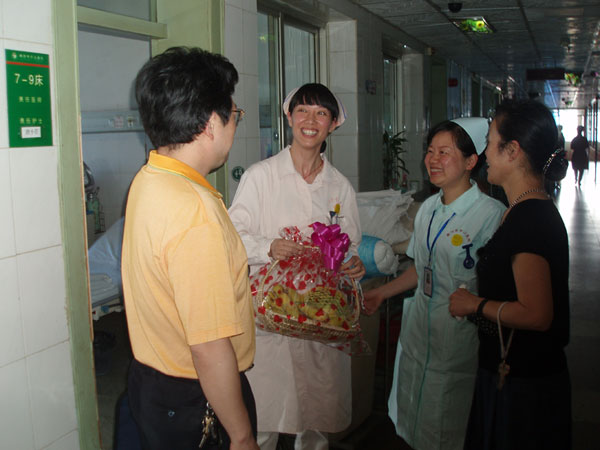 護士節(jié)的問候 發(fā)布時間:2004年5月14日 預(yù)覽:7513次 5月12日護士節(jié)這一天,院領(lǐng)導(dǎo)黃志堅、蔡春香率相關(guān)職能部門深入病區(qū)慰問一線護理人員,當(dāng)天,申錦林院長和護理部還分別以手機短信和慰問信等形式祝福全院護士節(jié)日快樂。(鄒建軍)