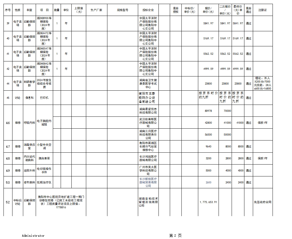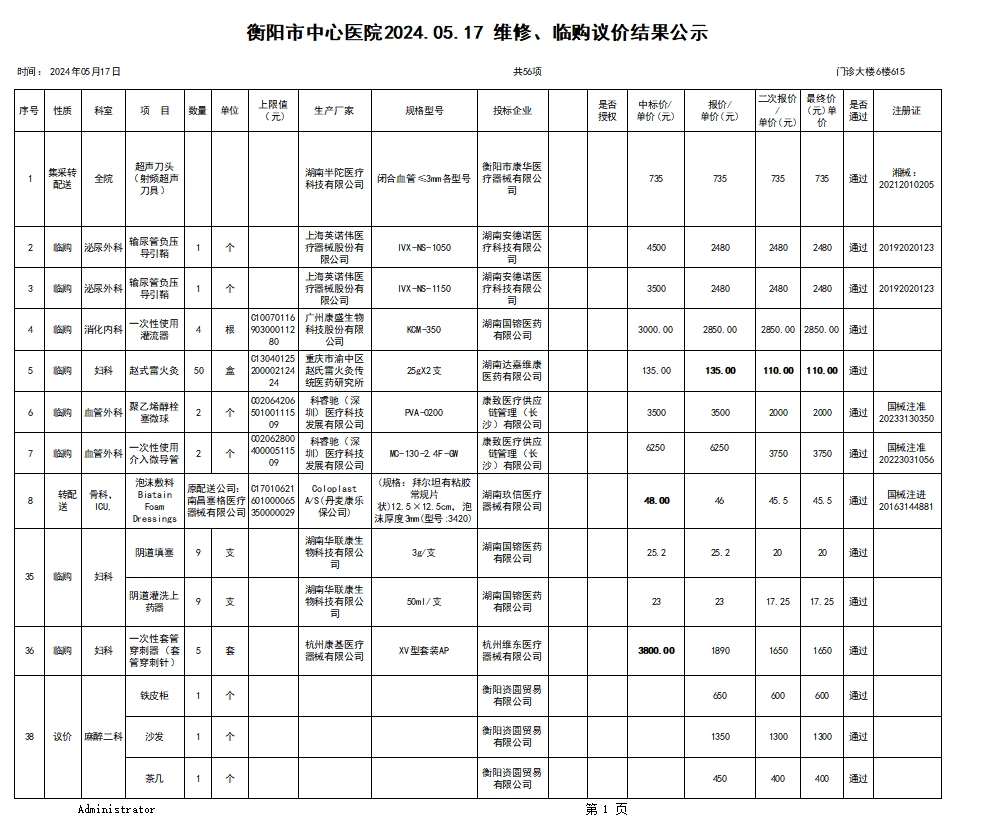 衡陽市中心醫(yī)院2024.05.17 維修、臨購議價結(jié)果公示