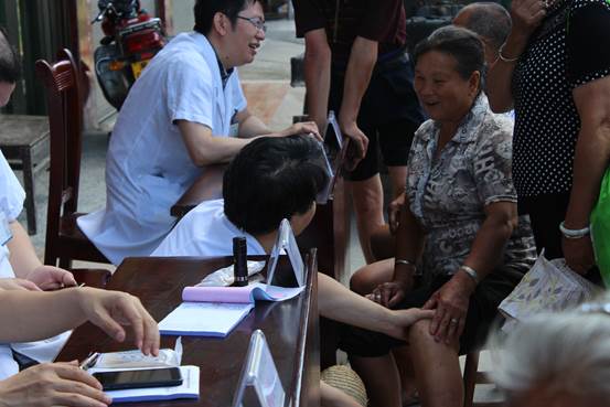 外科支部一行11人早早出發(fā),歷時兩個半小時,游過了衡陽的“新馬泰”(分別是耒陽的新市鎮(zhèn)、馬水鄉(xiāng)、太平圩鄉(xiāng)),終于趕上趕集的鄉(xiāng)親們。在亮源鄉(xiāng)衛(wèi)生院領導和同行的大力支持下,全體隊員主動搬桌子、椅子,9點鐘就鋪開了義診“攤位”。鄉(xiāng)民們看到衡陽大醫(yī)院來了博士、主任和這么多的教授,相互轉告,蜂擁而至一下子就將我們的專家圍個水泄不通,直到接近12點,最后一個從鄰近鄉(xiāng)趕來看骨病的鄉(xiāng)親得到專家滿意的答復后才漸漸散去,我們的專家才緩過神來喝上一口水。