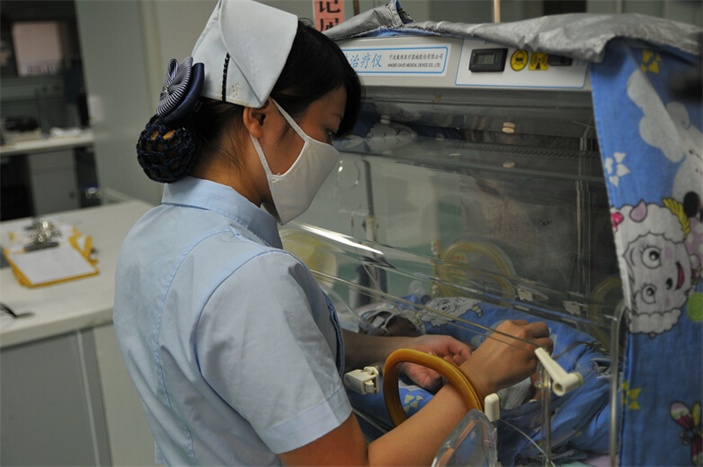 在衡陽(yáng)市中心醫(yī)院婦兒中心,新生兒重癥監(jiān)護(hù)病房有30張床位,分為3個(gè)區(qū):早產(chǎn)兒區(qū)、足月兒區(qū)及康復(fù)區(qū),每個(gè)區(qū)各由一名責(zé)任護(hù)士主管。病區(qū)配備心電監(jiān)護(hù)儀、遠(yuǎn)紅外線輻射臺(tái)、藍(lán)光治療箱/儀、呼吸機(jī)、空氧混合儀等設(shè)備。