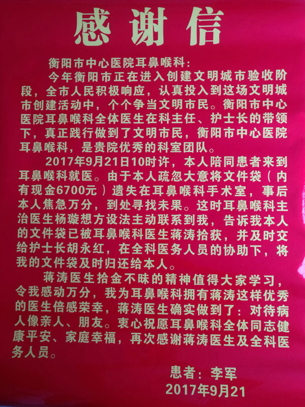衡陽市中心醫(yī)院華新分院2017年9月30日錦旗