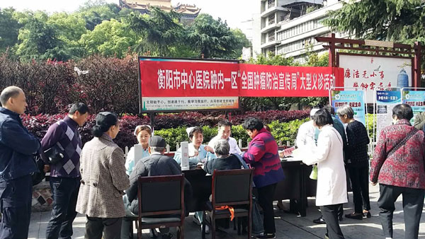 我院開展腫瘤防治知識(shí)宣傳及義診活動(dòng) 發(fā)布時(shí)間:2018年4月21日 預(yù)覽:2862次 來源:北京時(shí)間 2018-04-18 20:16:39 4月15日至4月21日是第二十四全國腫瘤防治宣傳周,衡陽市中心醫(yī)院腫內(nèi)一區(qū)攜手內(nèi)科一支部、三支部,機(jī)關(guān)一支部開展了以“科學(xué)抗癌,關(guān)愛生命——抗癌路上,你我同行”為主題的腫瘤防治知識(shí)宣傳及大型義診活動(dòng)。防治宣傳周一系列活動(dòng)旨在幫助大家預(yù)防腫瘤的發(fā)生,早期發(fā)現(xiàn)癌癥,盡早治療癌癥,幫助癌癥患者正確認(rèn)識(shí)癌癥,與醫(yī)院和社會(huì)各界人士攜手努力戰(zhàn)勝病魔。 上午8點(diǎn),在腫內(nèi)一區(qū)唐玉成主任的帶領(lǐng)下,醫(yī)護(hù)人員共10余人在雁峰廣場早早拉起“科學(xué)抗癌,關(guān)愛生命”全國腫瘤防治周主題宣傳橫幅及多幅腫瘤防治科普知識(shí)海報(bào),現(xiàn)場向轄區(qū)居民發(fā)放宣傳腫瘤防治知識(shí)宣傳單及資料 300余份,并為群眾提供義診、咨詢、答疑等多種形式的服務(wù)。他們向居民講解防治、抗癌的基本知識(shí),幫助大家樹立對腫瘤疾病的正確認(rèn)識(shí),引導(dǎo)居民養(yǎng)成健康的生活習(xí)慣,樹立“早發(fā)現(xiàn)、早診斷、早治療”的意識(shí)。當(dāng)天參與咨詢、義診的群眾達(dá)100余人次。 本次宣傳活動(dòng)受到廣大群眾的歡迎和好評,通過此次活動(dòng)的開展,使廣大群眾提高了防癌意識(shí),增加了科學(xué)知識(shí),產(chǎn)生了良好的社會(huì)影響。 通訊員 劉詩 相關(guān)鏈接:1.https://moment.rednet.cn/rednetcms/news/20180418/1242122.html?from=singlemessage2.http://sdjs.chinareports.org.cn/ylws/2018/0418/4690.html?from=singlemessage3.http://wap.e0734.com/show.php?newsid=803243&catid=854.http://hxxw.net/a/yiliao/20180427/30801.html?from=singlemessage