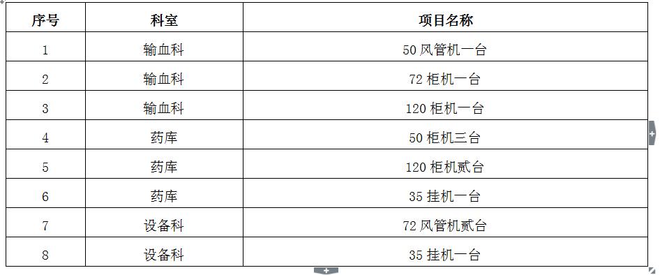 zxyy20180022招標(biāo)公告空調(diào)12臺(tái) 發(fā)布時(shí)間:2018年5月16日 預(yù)覽:3700次 因醫(yī)院發(fā)展的需要,我院擬于近期院內(nèi)招標(biāo)采購(gòu)一批空調(diào),歡迎具備條件的公司報(bào)名參加。一、采購(gòu)項(xiàng)目編號(hào)及產(chǎn)品名稱(一)采購(gòu)項(xiàng)目編號(hào):zxyy20180022(二)產(chǎn)品名稱詳見下表:二、報(bào)名時(shí)間:2018年5月16日至2018年5月21日請(qǐng)有意向參加投標(biāo)的公司于2018年5月16日至2018年5月21日下午5時(shí)前到采購(gòu)中心(門診綜合大樓六樓)遞交報(bào)名資料(投標(biāo)人公司工商執(zhí)照)并領(lǐng)取招標(biāo)文件。三、遞交報(bào)價(jià)截止日期:2018年5月25日下午5點(diǎn)(價(jià)格單獨(dú)密封,空調(diào)價(jià)格及配件價(jià)格單獨(dú)報(bào)單價(jià))四、聯(lián)系方式:聯(lián)系地址:衡陽(yáng)市雁城路10號(hào)聯(lián)系人:曾老師、王老師聯(lián)系電話:0734-8275875傳真號(hào)碼:0734-8275875電子郵箱:cgzx875@163.com 衡陽(yáng)市中心醫(yī)院2018年5月16日