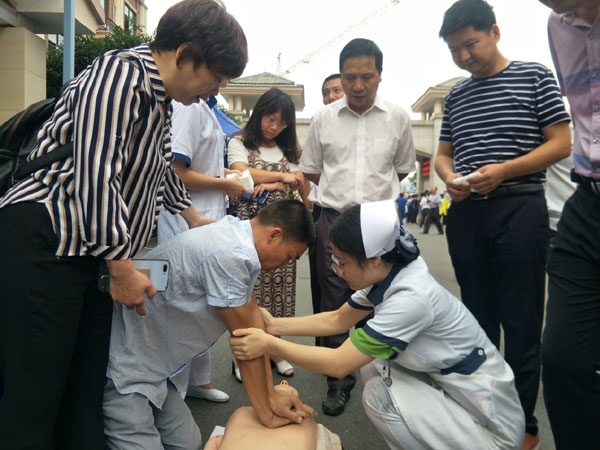 衡陽市中心醫(yī)院組隊參加本次科普活動,積極為市民宣傳“救”在身邊急救知識,醫(yī)務(wù)人員手把手教進行心肺復(fù)蘇的操作,市民們都踴躍參與。