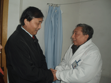 當(dāng)天下午,徐明華來(lái)到我院門診部二樓胸外科診室,陳業(yè)煌正在接診一名病人。徐明華親切地握著陳業(yè)煌的手說(shuō):“春節(jié)將至,我代表市委、市政府來(lái)看望您了,向您表示誠(chéng)摯的問(wèn)候?!苯又?,徐明華細(xì)心地問(wèn)起了陳業(yè)煌的從醫(yī)經(jīng)歷及家庭狀況,當(dāng)?shù)弥悩I(yè)煌已從事醫(yī)療工作51年,接診病人無(wú)數(shù),71歲的高齡仍堅(jiān)持看門診,在病人心目中享有盛譽(yù)等事跡后,他對(duì)陳業(yè)煌給予了高度評(píng)價(jià),稱他“醫(yī)術(shù)高明,醫(yī)德高尚,是醫(yī)務(wù)人員的楷模?!?/P>