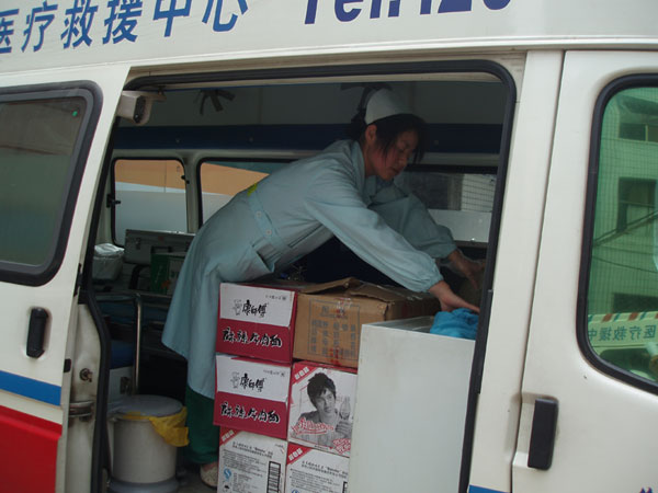 5月13日下午,市中心醫(yī)院憑著多年積累的緊急救援經(jīng)驗(yàn)和職業(yè)敏感,在第一時(shí)間開始啟動(dòng)《重大自然災(zāi)害醫(yī)療救援應(yīng)急預(yù)案》,成立了專門組織機(jī)構(gòu),配備了相關(guān)醫(yī)務(wù)人員和物資,設(shè)計(jì)了具體工作流程。5月14日上午8時(shí),醫(yī)院院長申錦林在接到上級(jí)指令后,當(dāng)即提出“把保護(hù)災(zāi)區(qū)人民生命安全放在第一位”,立即通知相關(guān)人員進(jìn)行集結(jié)。半個(gè)小時(shí)后,6名年輕力壯的司機(jī),3臺(tái)配置呼吸機(jī)、監(jiān)護(hù)儀、除顫儀等一流搶救設(shè)施的救護(hù)車以及相關(guān)急藥品和食品迅速組織到位。11時(shí)許,在劉小平副院長的帶領(lǐng)下,三支救護(hù)隊(duì)按照要求從醫(yī)院整裝出發(fā),下午兩點(diǎn)抵達(dá)省衛(wèi)生廳與兄弟醫(yī)院匯合,隨即趕赴災(zāi)區(qū)。