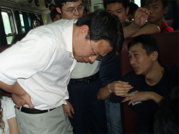 6月18日,市中心醫(yī)院院長(zhǎng)申錦林教授帶領(lǐng)該院心臟中心和腦科中心學(xué)科負(fù)責(zé)人乘坐N605次列車赴廣東省人民醫(yī)院參加一個(gè)學(xué)術(shù)活動(dòng)。下午2時(shí),當(dāng)列車即將行駛到韶關(guān)車站時(shí),列車廣播突然喊話:“15號(hào)車廂有乘客病重,車上如有醫(yī)生,請(qǐng)速到現(xiàn)場(chǎng)?!鄙赍\林院長(zhǎng)聽(tīng)到后,立即安排心血管內(nèi)科博士蔣路平和醫(yī)務(wù)部部長(zhǎng)唐業(yè)華趕去救援。由于當(dāng)次列車乘客特別多,走道上擠滿了人,加上天氣悶熱,專家們?cè)诖┰搅耸畮坠?jié)車廂時(shí)非常費(fèi)勁。二十分鐘后,當(dāng)專家們到達(dá)15號(hào)車廂時(shí),衣服已被汗水濕透。乘客們看見(jiàn)專家來(lái)了,迅速騰出空間。專家們發(fā)現(xiàn),患病男子年約30多歲,臉色蒼白,大汗淋漓,呻吟不止。經(jīng)過(guò)診斷,專家們認(rèn)為該男子是胃潰瘍引發(fā)絞痛,便立即實(shí)施簡(jiǎn)單的手法治療和藥物治療,半個(gè)小時(shí)后,病人轉(zhuǎn)危為安,連聲道謝。