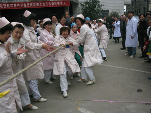 “天使”拔河 健身強體 發(fā)布時間:2009年3月10日 預(yù)覽:3959次 本報訊 為了以健康的體魄更好地服務(wù)患者,我院通過全員健康體檢及舉辦登山、球賽等健身活動,既提高了醫(yī)務(wù)人員身體素質(zhì),又促進了團結(jié)協(xié)作精神。圖為3月10日拔河比賽的情景。(鄒建軍攝)
