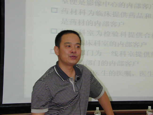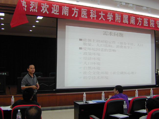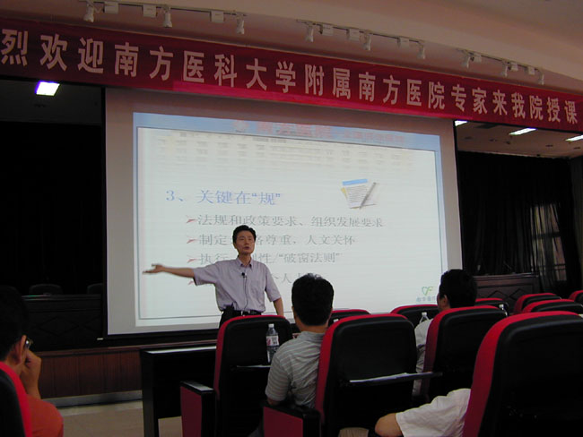 南方醫(yī)科大學(xué)附屬南方醫(yī)院專家來我院傳經(jīng)送寶 發(fā)布時間:2009年8月21日 預(yù)覽:4309次 8月4日,我院邀請了南方醫(yī)科大學(xué)附屬南方醫(yī)院領(lǐng)導(dǎo)和專家來我院傳經(jīng)送寶。醫(yī)院干部職工、市區(qū)的部分醫(yī)院、縣區(qū)的網(wǎng)絡(luò)醫(yī)院客人聞聲來到我院21樓綜合會議室。這天上午南方醫(yī)科大學(xué)附屬南方醫(yī)院醫(yī)務(wù)處處長、教授廖四照首先主講了《醫(yī)院服務(wù)營銷》;接著南方醫(yī)科大學(xué)附屬南方醫(yī)院王晉豫教授主講了《精益在醫(yī)院管理中的應(yīng)用》。下午,南方醫(yī)科大學(xué)附屬南方醫(yī)院院長、教授耿仁文主講了《提升以人為本的醫(yī)院文化》,三位領(lǐng)導(dǎo)和教授深入淺出的講學(xué)使聽眾受益非淺。(張永明)
