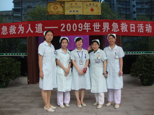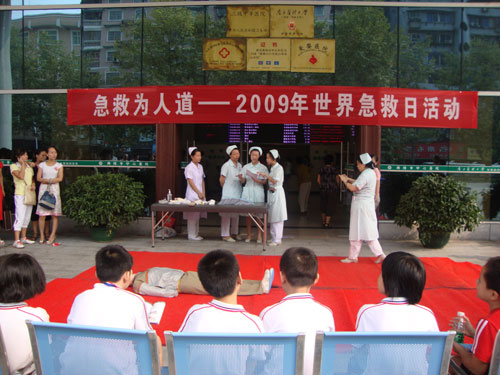 世界急救日宣傳活動 發(fā)布時間:2009年9月15日 預(yù)覽:4244次 值第五個“世界急救日”來臨之際,為彰顯我市120急救中心在我院的社會職能,提高衡陽市廣大市民急救意識,普及急救知識,讓更多的社會人士掌握急救技能,在事發(fā)現(xiàn)場挽救生命和降低傷害程度。在護理部策劃下,急診科于2009年9月12日上午在門診大樓前坪向全體市民舉辦了“急救為人道”的社會公益活動。四名急診??谱o士現(xiàn)場演示急救技能操作(徒手心肺復(fù)蘇、簡易固定、止血包扎、氣管異物排除等),多名觀眾主動上臺學習急救技能操作。歐陽茴香主任用通俗易懂的方式解答市民提出的急救問題,工會還準備精美小禮品發(fā)給參與有獎問答的觀眾,1000本常用急救手冊發(fā)放一空,現(xiàn)場氣氛輕松活躍。成章小學張校長聞訊帶領(lǐng)全體老師大早來到醫(yī)院,自己也學的非常認真,他說“香港小學要求學生人人掌握徒手心肺復(fù)蘇,以備不時之需,回去我們要全員培訓(xùn),非常感謝貴院給我們提供了這些知識?!?自2005年開始,紅十字會與紅新月會國際聯(lián)合會將每年9月的第二個星期六定為 “世界急救日”。 護理部 來臨