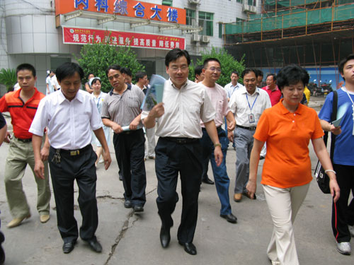 省衛(wèi)生廳廳長(zhǎng)張健來(lái)我院調(diào)研 發(fā)布時(shí)間:2008年8月27日 預(yù)覽:4512次 8月27日,省衛(wèi)生廳廳長(zhǎng)張健來(lái)我院開(kāi)展工作調(diào)研活動(dòng),副市長(zhǎng)許滿意、市衛(wèi)生局局長(zhǎng)趙安民等相關(guān)領(lǐng)導(dǎo)陪同調(diào)研。 調(diào)研行程中,我院院長(zhǎng)、黨委書(shū)記申錦林就醫(yī)院為民辦實(shí)事、人才隊(duì)伍建設(shè)及醫(yī)療設(shè)備裝備等情況向張健作了詳細(xì)匯報(bào),張健對(duì)我院近年來(lái)在內(nèi)部管理、人才引進(jìn)、基本建設(shè)、醫(yī)院規(guī)劃等方面所做的大量工作給予了充分肯定,對(duì)醫(yī)院綜合實(shí)力的明顯提高表示滿意。隨后,調(diào)研組一行還饒有興致地參觀了我院即將投入使用的門診綜合大樓。(鄒建軍)